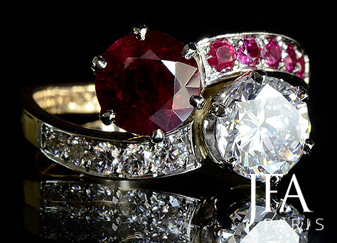Diamant d'environ 1 carat, rubis 1.20 ct, entourage de rubis et de diamants