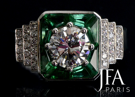Bague réalisée dans le style Art-Déco sertie en son centre d´un diamant entouré d´émeraudes calibrées, ajustées sur oeuvre et de diamants en escalier.